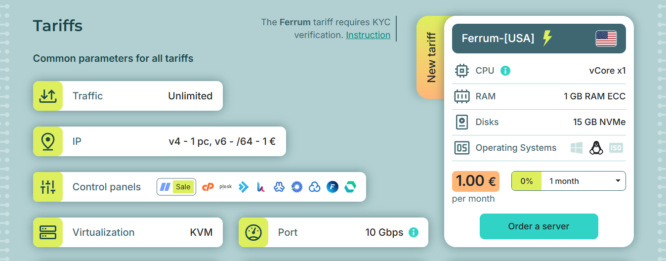 - Закажите минимальный тариф в локации USA (обычно это тарифы линейки "Ferrum" за 1 евро или акционные предложения).