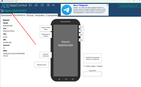 На скришоте показа подключенный телефон в программу отладки ADB.