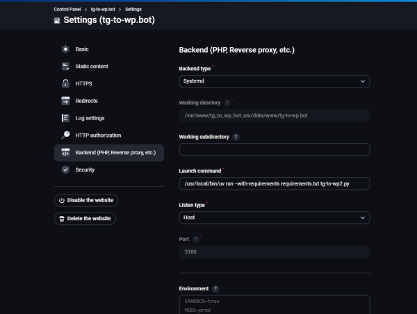 Результат: Fastpanel создаст системный юнит, который будет следить за ботом. uv создаст свой локальный кеш именно внутри папок проекта, а не полезет в /root. Если бот упадет — панель его поднимет. Если ты обновишь код — просто нажми «Перегрузить» в интерфейсе панели Services твоего проекта. При этом в твоей операционной системе не появится ни одного нового Python-пакета в apt или глобальном pip.