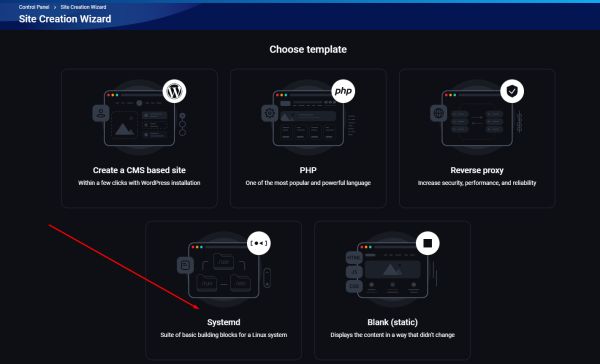 Теперь самое важное: как запустить это «чисто» через интерфейс панели. Зайди в Fastpanel → Нажми кнопку Создать сайт и выбери шаблон systemd
