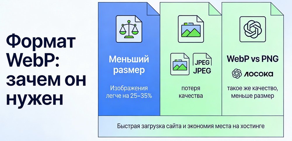 WebP — это формат графического файла, разработанный компанией Google в 2010 году. Его особенностью является продвинутый алгоритм сжатия, позволяющий сократить размер картинки без видимых потерь в качестве. При разработке формата сотрудники Google использовали те же методики сжатия, что используются в компрессии видеокодека VP8.
